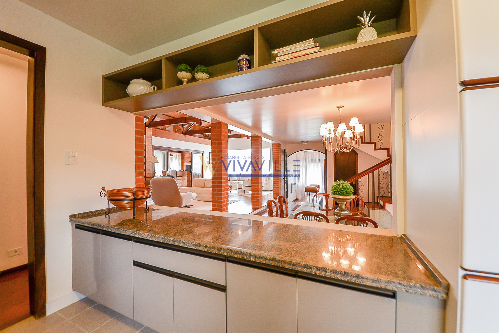 - Sala ampla para 3 ambientes, com piso em madeira e detalhes em tijolo a vista, forro em madeira, lareira e solarium